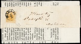 1850 - 5c arancio su fascetta di giornale diretta nei Paesi della Lega Austro-Italica da 'MILANO 8/3' a Modena. [..]