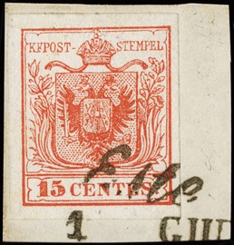 1850 - 15c rosso I tir. annullato 'ESTE 1 GIU' su frammento. Primo giorno d'uso dei francobolli di Lombardo Veneto. [..]