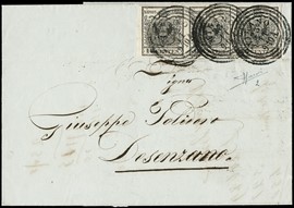 1850 - 10c grigio argenteo, I tir., tre esemplari di cui 1 BdF da 'NOALE 23 DIC.' 1850 a Verona. Firme Giulio [..]