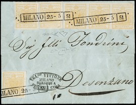 1850 - 5c giallo arancio chiaro, tre esemplari e striscia di tre da 'MILANO 25-5 51' a Desenzano. Firma Giulio [..]