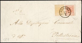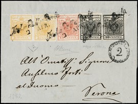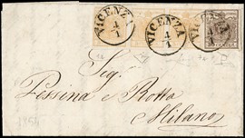 1850 - 5c giallo arancio chiaro, coppia, 10c nero intenso, due esemplari e 15c rosa carminio da 'ISOLA DELLA SCALA [..]