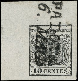1850 - 10c nero intenso con grande AdF, annullato 'PADOVA 6. MAG'. Piccola riparazione, esemplare comunque spettacolare. [..]