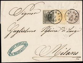 1850 - 10c nero (tiratura antica), tre ST3, delle quali due al recto e una al verso di 'RACCOMANDATA' da 'SABBIONETTA [..]