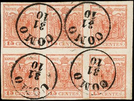 1850 - 15c rosso, I tipo, tre esemplari da 'MILANO, 1850