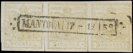 1850 - 5c giallo limone verdastro I tir., colore particolarmente chiaro, striscia orizzontale di tre usata a 'MANTOVA [..]