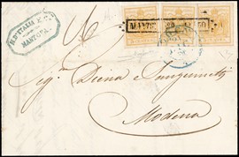 1850 - 5c giallo arancio I tir. tre esemplari da 'MANTOVA 20 - 12 -50' a Modena. Rara affrancatura. Sigle A.Diena, [..]