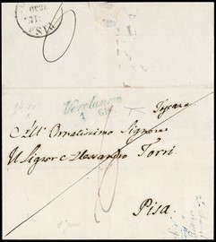 1850 - Lettera non affrancata da 'VEROLANOVA 1 GIU.' 1850 (cor. azzurro) a Pisa, tassata in arrivo '6' crazie. [..]