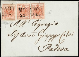 1850 - 15c rosso, I tipo, tre esemplari da 'MILANO 22 LUG' (SD) a Padova. Sigla A.Diena, CF Caffaz (Sassone 3+pt.6 [..]