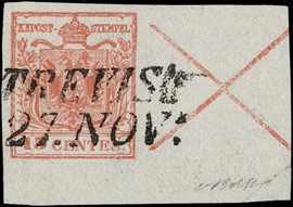 1850 - 15c rosa, II tipo, I sottotipo, III tav. AdF con croce completa di Sant'Andrea a destra, annullato 'TREVISO [..]