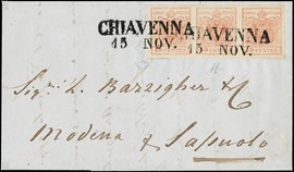 1850 - 15c rosa, II tipo, III tav., striscia di tre da 'CHIAVENNA 15 NOV.' a Sassuolo. Sigle A.Diena e E.Diena [..]