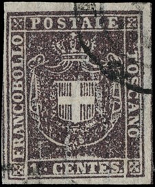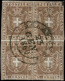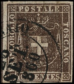 1860 - 1c bruno lilla, BL4 annullato con doppio cerchio grande 'SERRAVEZZA 23 GEN 1860' (completo). I mese d'uso, [..]