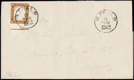 1862 - 10c bruno scuro BdF inferiore con riga di colore da 'POLLA 6 NOV. 1862' a Napoli. Raro, CF E.Diena (Sassone [..]