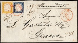 1862 - 20c indaco con riflessi violacei e Sardegna 80c giallo arancio su 'Raccomandata' da 'MILANO 17 SETT 62' [..]