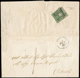 1860 - 5c verde con grandi margini bianchi, annullato con muto a losanga, al verso di lettera spedita in porto [..]