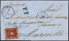 1860 - 40c carminio cupo con margini enormi, da 'LIVORNO 1 FEB 61' a Marsiglia. Molto rara di questa qualita'. [..]