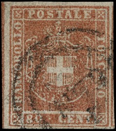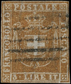 1860 - 3L ocra arancio con margini completi, annullato con parte di muto a sbarre. Rarissimo esemplare perfetto [..]
