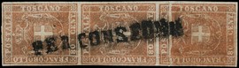 1860 - 80c bistro carnicino, ST3 verticale con grandi margini bianchi, annullata con il bollo lineare 'PER CONSEGNA'. [..]