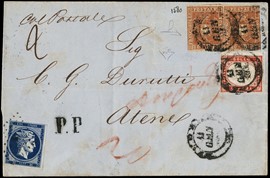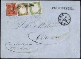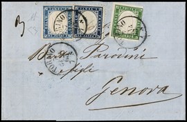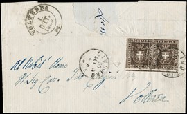 1861 - Sardegna 5c verde oliva e 10c grigio olivastro scuro, in affrancatura mista con Toscana GP 40c carminio, [..]