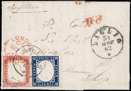 1862 - 20c indaco e 40c rosso carminio da 'LAGLIO 31 OTT 62' (CO) a Wellington (Salop / Inghilterra). Splendida [..]