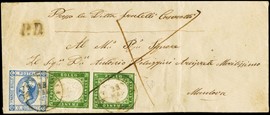 1862 - Sardegna 5c verde scuro, due esemplari in affrancatura tricolore mista con Regno 10c bistro giallastro, [..]