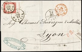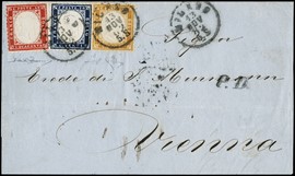 1862 - 10c bistro, 20c indaco e 40c rosso carminio scuro da 'MILANO 13 NOV 62' a Vienna. Eccezionale affrancatura [..]