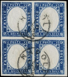 1863 - 15c azzurro tipo Sardegna, BL4 ottimamente marginato, annullato 'NAPOLI 1 FEB 63'. CF Colla e Sorani (Sassone [..]