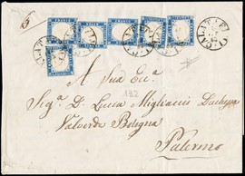 1863 - 15c celeste latteo, sei esemplari tutti ben marginati, da 'CALATAFIMI 8 FEB 63' a Palermo, in tariffa da [..]