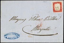 1863 - 15c litografico II tipo con leggera doppia stampa in basso, in affrancatura mista con Sardegna 5c verde [..]