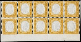 1862 - 80c giallo, blocco di 10 AdF, i cinque esemplari inferiori non dentellati in basso (pos.40/50), la pos.50 [..]