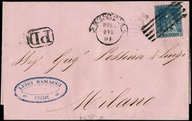 1858 - II emissione, 6cr azzurro chiaro su busta di colore rosa vivace, da 'FIRENZE 16 MAG 1858' a Milano (Sassone [..]