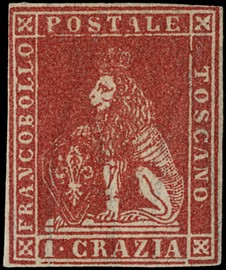1857 - II emissione, 1cr carminio, esemplare con grandi margini bianchi sui quattro lati e annullo leggero, perfetto. [..]