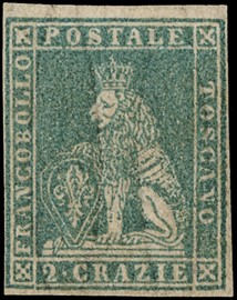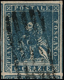 1851 - 1cr carminio violaceo e 2cr azzurro vivo, entrambi su carta azzurra, annullarti con 'muto a ragno' da 'FIRENZE [..]