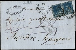 1857 - II emissione, 6cr azzurro cupo, coppia orizzontale molto ben marginata da 'LIVORNO 24 DIC 57' a Marigliano. [..]