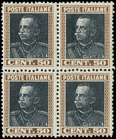 1927 - Vittorio Emanuele III, 50c bruno e nero intenso BL4, SL. CF Manzoni (Sassone 218a - Euro 6.600+)