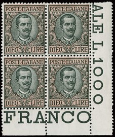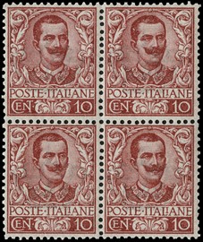 1910 - Floreale,10L oliva e rosa BL4 AdF, discreta/buona centratura (Sassone 91 - Euro 1.400+)
