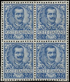 1901 - Floreale, 25c azzurro BL4 con i bordi degli esemplari adiacenti sui quattro lati, due SL e due TL, ottima [..]