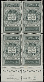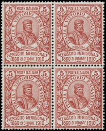 1910 - Garibaldi, la serie completa di quattro valori in BL4, discreta/buona centratura. CF Manzoni (Sassone 87/90 [..]