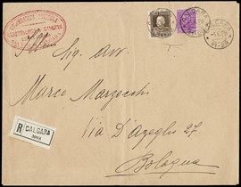 1929 - Vittorio Emanuele III, 1,75L bruno dent.13 3/4 e 50c violetto, su busta raccomandata da 'CALCARA 5 GIUGNO [..]