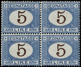 1874 - 5L azzurro e bruno BL4, buona centratura. I due esemplari in alto TL, gli altri SL. CF Manzoni (Sassone [..]