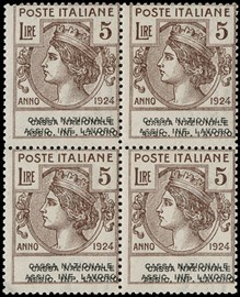 1924 - Enti Parastatali: 5L bruno scuro 'CASSA NAZIONALE ASSIC. INF. LAVORO' con doppia stampa della dicitura [..]