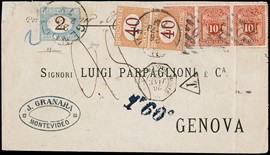 1878 - Uruguay, 10c carminio, emissione 1877/78, ST3 annullata ovale a sbarre 'G' in azzurro, su lettera da Montevideo [..]