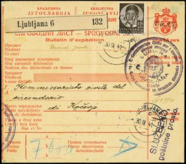 1941 - Lubiana: francobolli di Jugoslavia, 25p bruno nerastro, soprastampa a mano, su bollettino pacchi da 'LJUBLJANA [..]