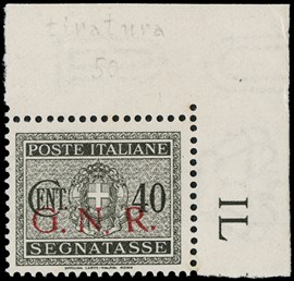 1943 - GNR, Segnatasse, 40c grigio bruno, soprastampa del I tipo, AdF, con “R' inclinata a sinistra, SL. CF Sorani [..]