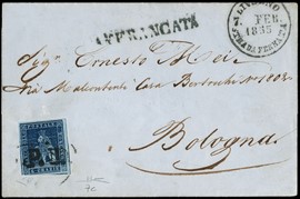 1851 - I emissione, 20c azzurro da “TORINO 19 AGO 1853' a Genova. Lettera tassata a penna “2' e “Sup Tassa' (supplemento [..]