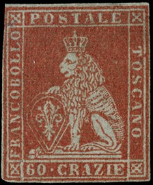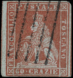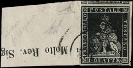 1851 - 60cr scarlatto su grigio con quattro margini bianchi e filetto marginale di contorno a sinistra (riga di [..]