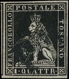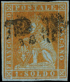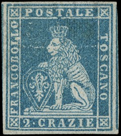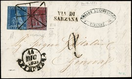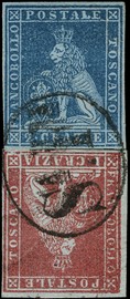 1851 - 1cr carminio violaceo e 2cr azzurro vivo, entrambi su carta azzurra, annullarti con 'muto a ragno' da 'FIRENZE [..]