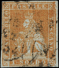 1851 - 1s giallo oro su carta azzurra, usato con margini bianchi su tutti i lati. Sigla Gugliemo Oliva, CF Manzoni [..]