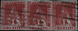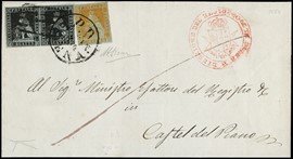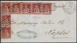 1851 - 1cr carminio chiaro su carta grigia, da 'LIVORNO 20 OTT 1854' a Napoli; ST7 'a seggiola'. Massima striscia [..]