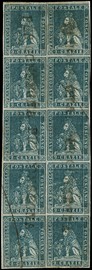 1851 - 1cr carminio violaceo su carta azzurra e 1cr carminio bruno su carta grigia; due strisce orizzontali di [..]