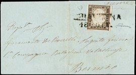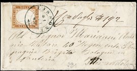 1862 - Sardegna 10c arancio brunastro, uso isolato in tariffa ridotta per militari su lettera di piccolo formato [..]